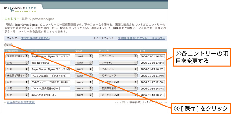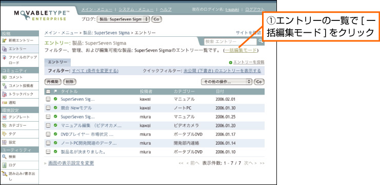 エントリーのタイトルや公開/非公開、カテゴリーなどを変更したいとき、通常はエントリーの一覧から目的のエントリーを選びます。複数のエントリーを効率よく変更したいときは、「一括編集モード」が便利です。