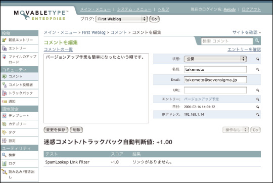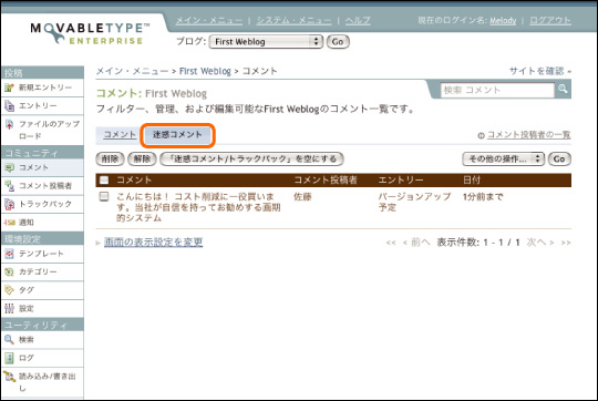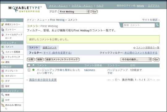 Movable Typeが受け付けたコメントは、以下のように一覧を表示してから管理できます。