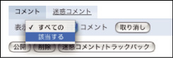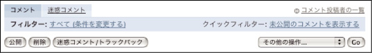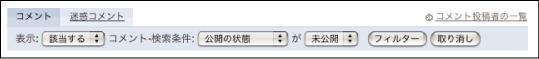 システム・ツールバーやブログ・ツールバーから、コメントの一覧を表示したときには、フィルター機能を利用することによって、必要なコメントを絞り込めます。「フィルター」機能の利用法は以下のようになります。
