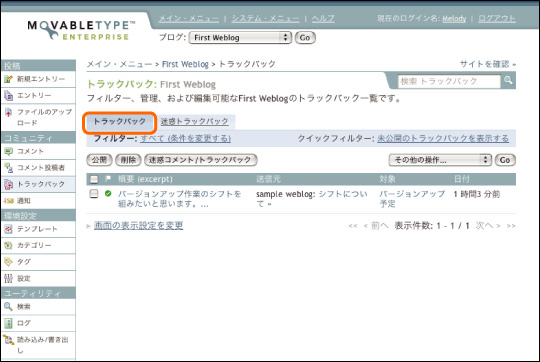 Movable Typeが受け付けたトラックバックは、以下のように一覧を表示してから管理できます。