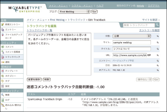 トラックバック一覧からトラックバックのタイトルをクリックするとトラックバック編集画面が開き、そのトラックバックを細かく編集できます。編集が終わったら[変更を保存]ボタンを押して変更を保存してください。