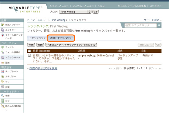 迷惑コメンと判断したトラックバックにチェックを入れ、画面上部の[迷惑トラックバック/トラックバック]ボタンを押すと、そのトラックバックは迷惑トラックバックとして処理されます。