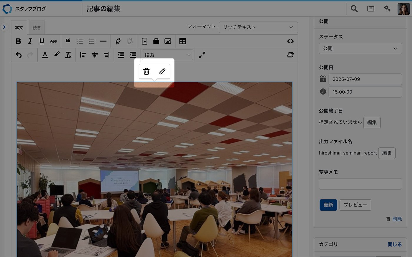テキストフォーマットがブロックエディタもしくはリッチテキストの場合、挿入した画像の編集ボタンから画像の変更ができ、代替テキスト、キャプション、画像サイズなども編集できます。