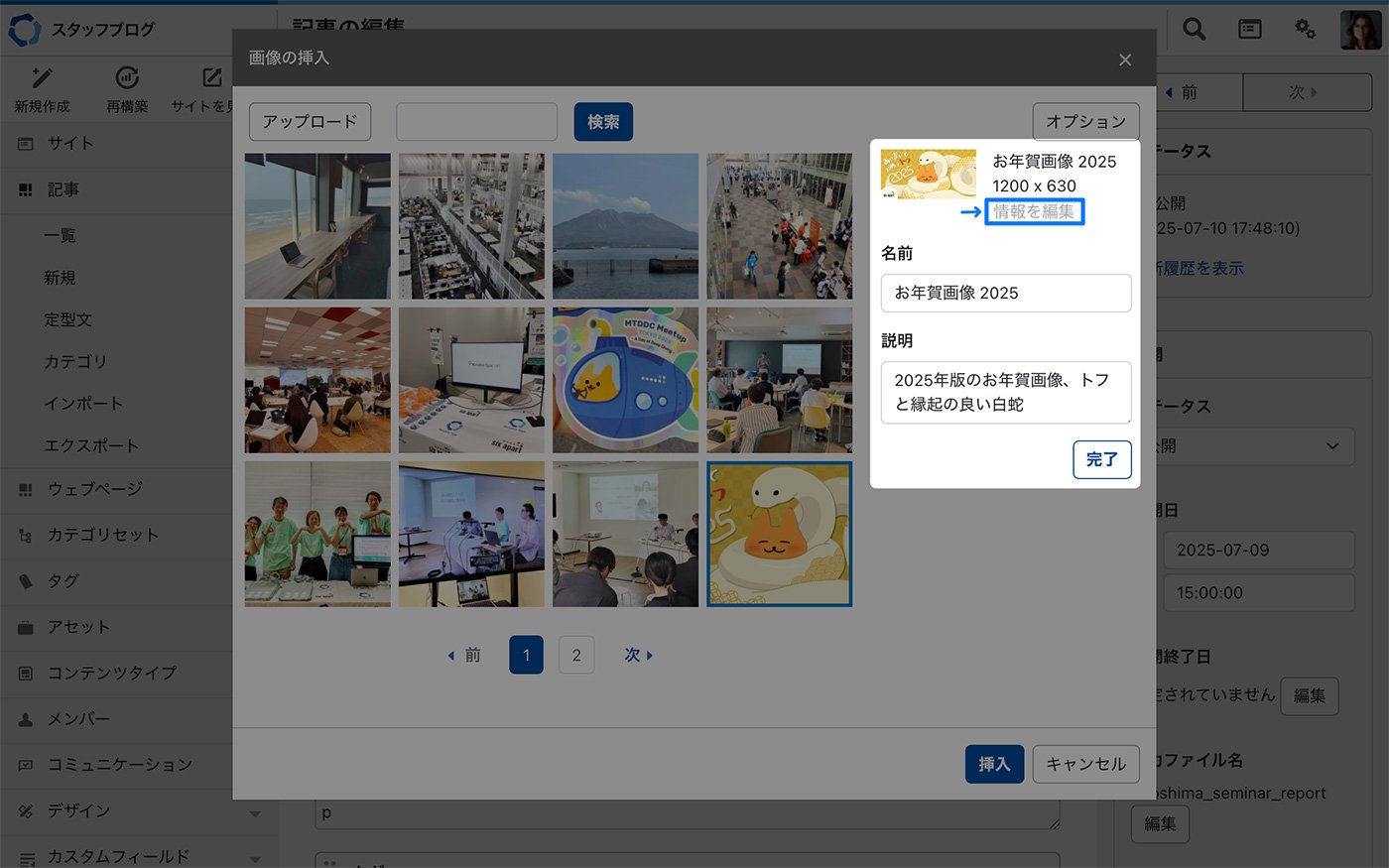 画像挿入ウィンドウを開くとサムネイル画像の一覧を表示するように改善しました。視覚的に画像を確認しながら目的の画像アセットを素早く選択できるため、記事作成時の画像挿入作業がスムーズになります。