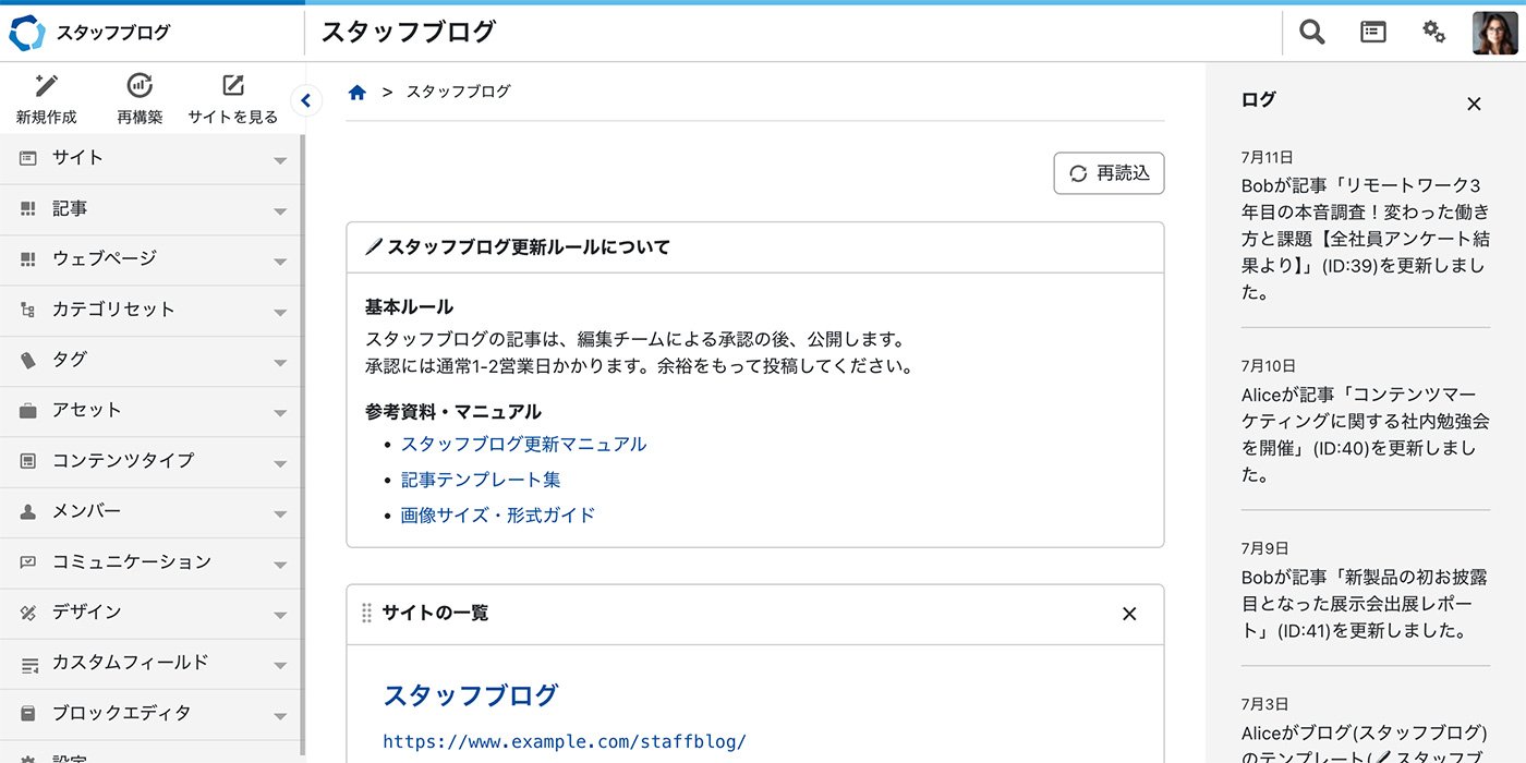 サイト管理者から運用担当者へのお知らせや、マニュアルへのリンク、最新記事へのリンク、よく使うサイトへのリンクなど、利用者向けの情報や作業を効率化するためのリンクなどを掲載できます。