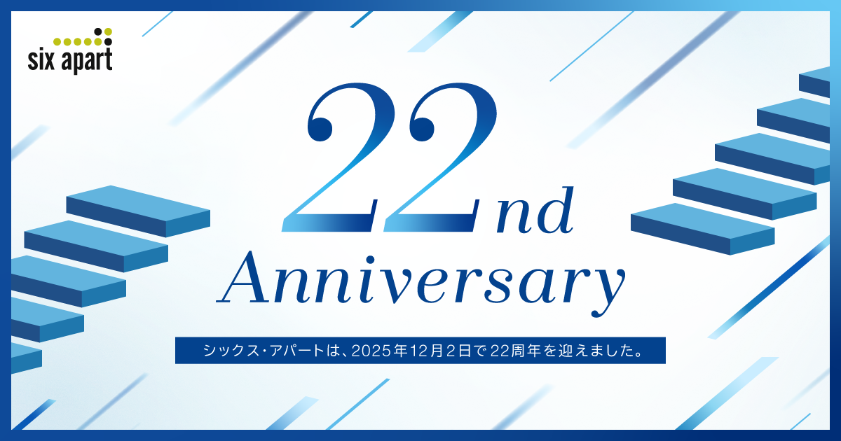 本日2025年12月2日、シックス・アパート株式会社は設立22周年を迎えました。シックス・アパートの製品・サービスを支えてくださっているユーザーの皆さま、パートナー企業の皆さま、コミュニティの皆さまのご支援のおかげです!ありがとうございます。