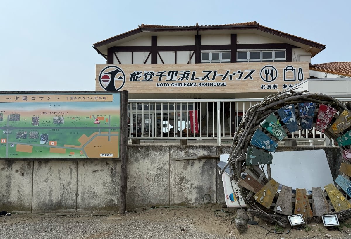 金沢駅からは、能登半島の海岸線に沿って走る「のと里山海道」を車で小一時間ほどで到着です。この「能登千里浜レストハウス」の一階がお土産屋さんとお食事処、二階がワークスペースになっています。