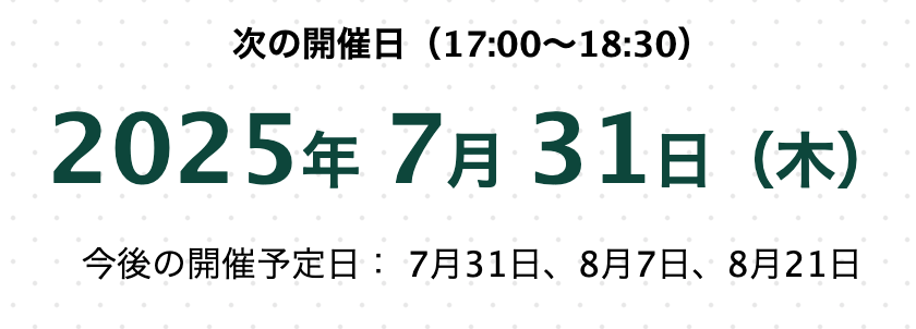 そして、Zoom お気軽相談室の次回開催日をお知らせするページを用意しました。次回以降の開催日や、参加方法、注意事項、相談例などご紹介していますので、参加前にお目通しくださるとスムーズです。