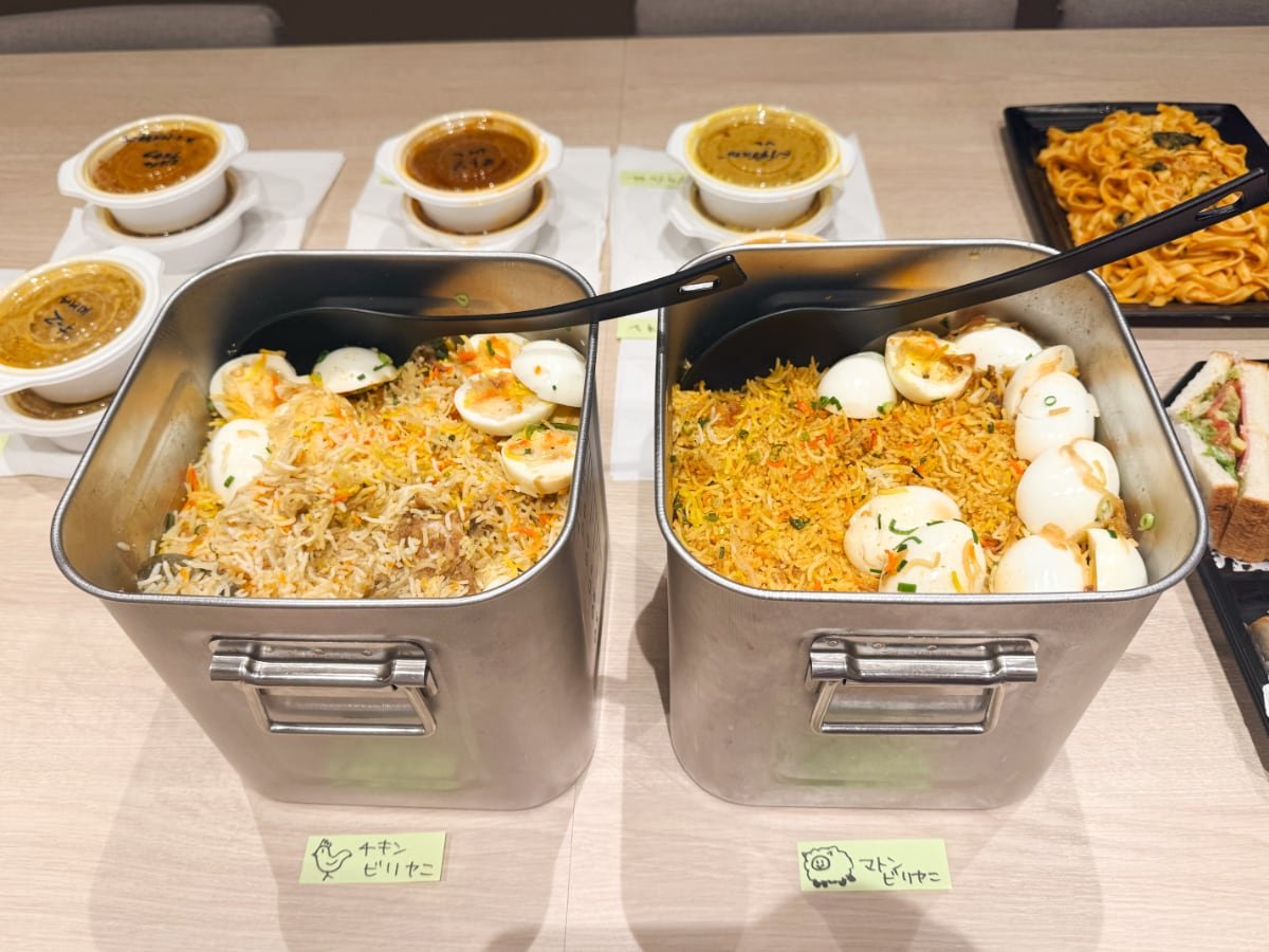 前回はチキンビリヤニのみでしたが、今回は参加人数が増えたこともあって、写真のとおりチキン&マトンの2ポットに増量です。