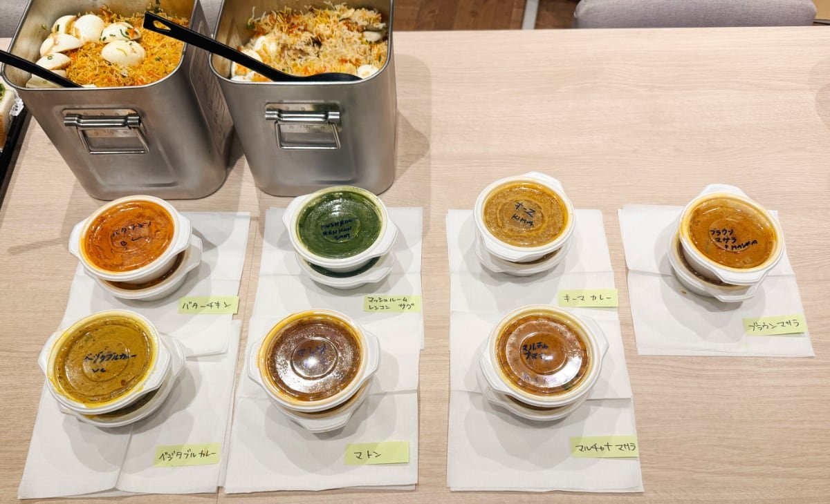 人数も増えたので、カレーもベースが異なる7種類を用意してみました。どれも美味しかったですが、上段左から2番目にある緑色のほうれん草ベースのカレー「マッシュルームとレンコンのサグ」が人気でした。