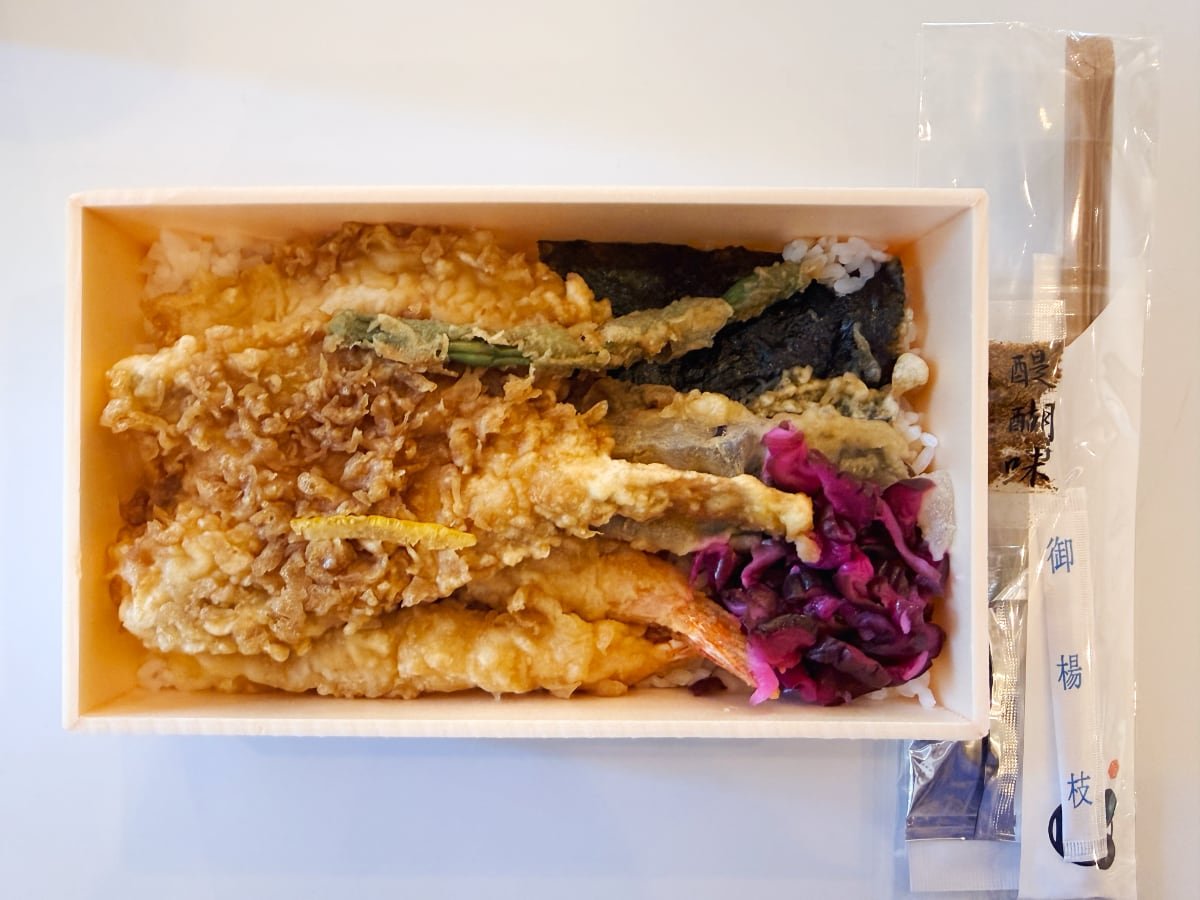 この日のランチは金子半之助の天丼弁当でした。写真右側の箸袋の上に添えられている小袋は、山椒が効いた黒七味の唐辛子「醍醐味」です。天どんそのままでも、もちろん美味しいのですが、この七味を天ぷらにかけて食べるとほどよい刺激でキリッと味が際立って、幸せなのです。