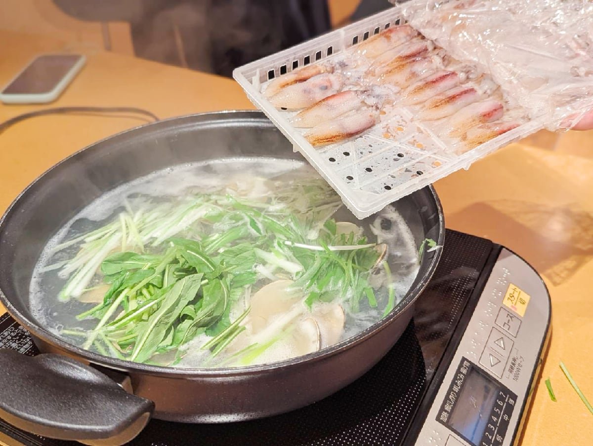 わかめを楽しんだ後は、野菜も追加して、ホタルイカの出番です。ひとつひとつ丁寧に目や筋を取って下処理したホタルイカはキラッキラです。