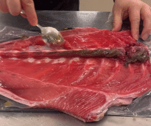 骨の間にたっぷり残っている身をスプーンでこそげて集めていきます。下のGIFアニメを見れば分かるとおり、思ったよりもたっぷり身がとれます。